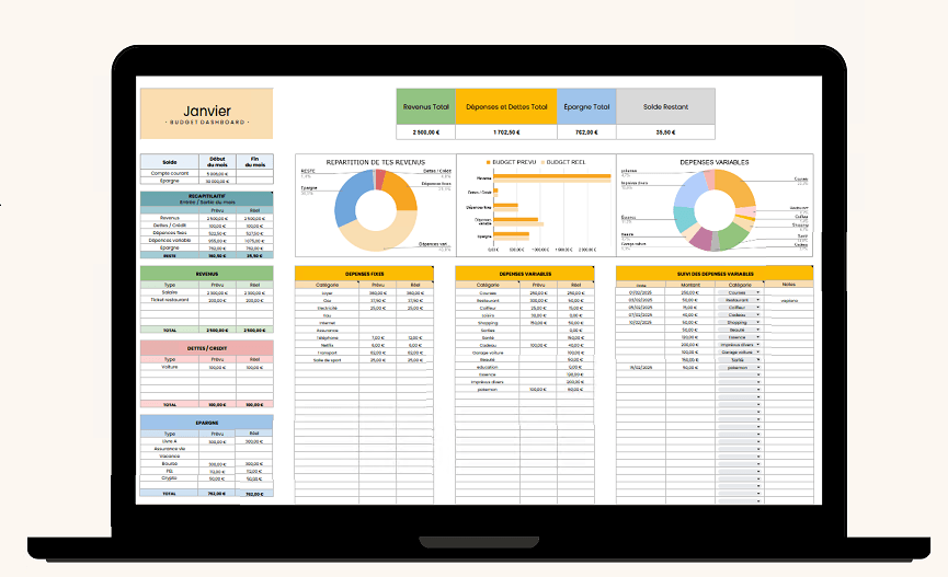 Tout est prévu : dépenses fixes, variables, abonnements, objectifs, imprévus.